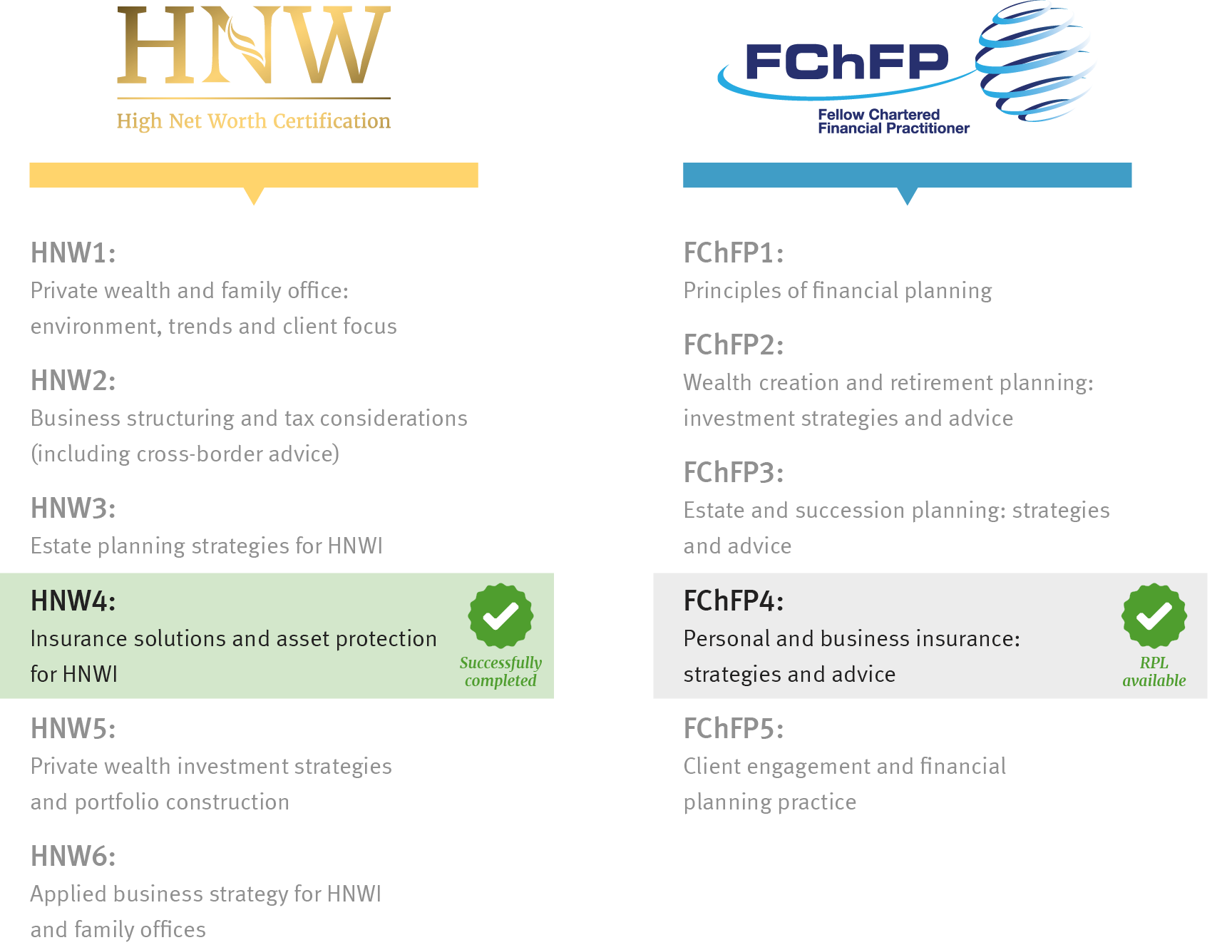 Individuals who successfully completed the subject HNW4 Insurance Solutions and Asset Protection for High-Net-Worth Individuals may be eligible to receive credit towards FChFP4: Personal and Business Insurance – Strategies and Advice. This ultimately reduces the time to complete the FChFP Certification by one subject – 4 in total instead of 5.